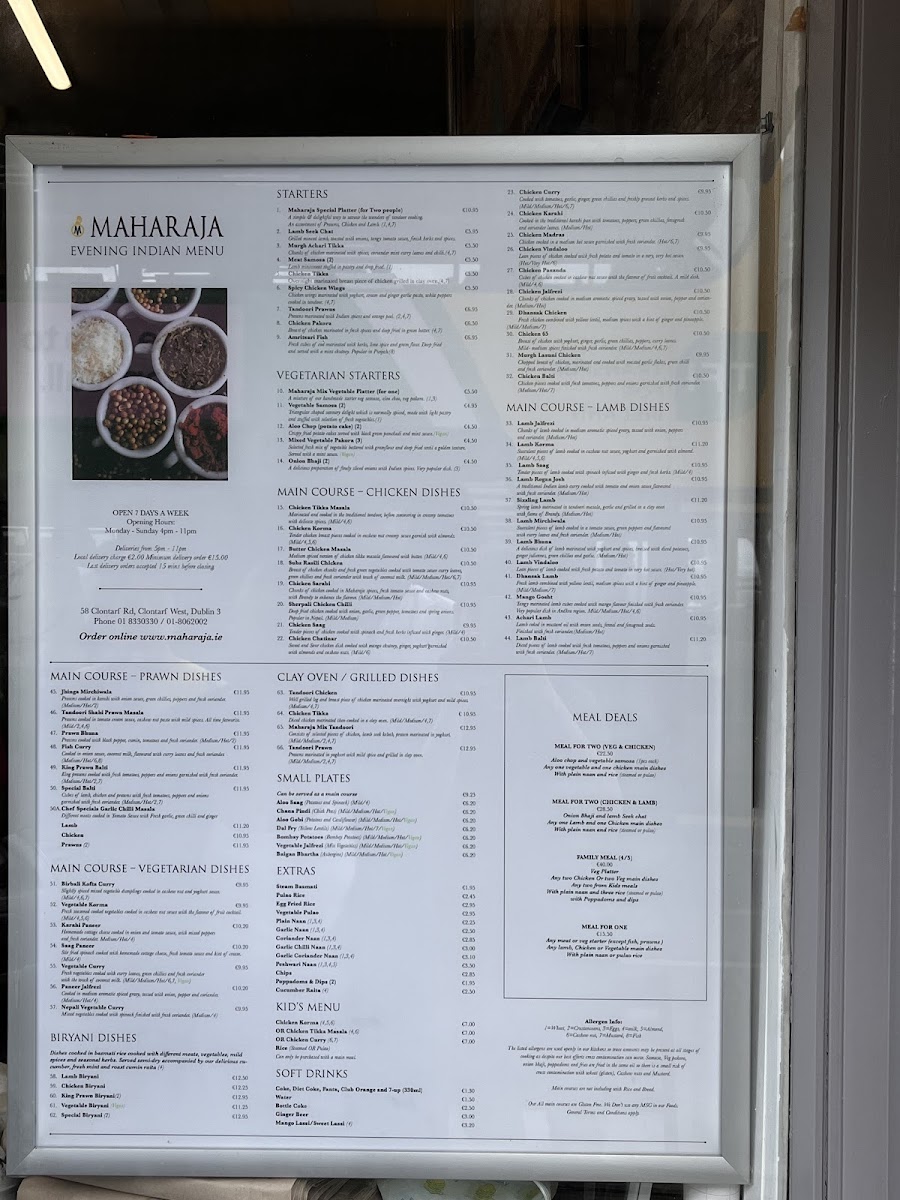 The menu at Maharaja Indian Dublin offers a diverse and flavorful selection of dishes, catering to a wide range of tastes. For meal deals, there are options like the Meal For Two (Veg & Chicken) and Meal For Two (Chicken & Lamb), providing a perfect combination of flavors for sharing. Starters such as the Maharaja Special Platter (for two people), Lamb Seekh Chaat, and Chicken Tikka Starter set the tone with rich, aromatic flavors. For vegetarians, the Maharaja Mixed Vegetable Platter and Vegetable Samosa offer satisfying choices. The chicken dishes are a highlight, with favorites like Chicken Tikka Masala, Butter Chicken Masala, and the spicy Subz Rasili Chicken. Lamb lovers can indulge in dishes like Lamb Rogan Josh, Lamb Korma, and the zesty Lamb Jalfrezi, while seafood enthusiasts can savor the Tandoori Shahi Prawn Masala and King Prawn Balti. The vegetarian section shines with the Birbali Kofta Curry, Karahi Paneer, and Saag Paneer. For a complete meal, the Biryani Dishes such as Lamb Biryani and Special Biryani are a must-try. Clay oven and grilled options like Tandoori Chicken and Maharaja Mixed Tandoori are perfect for those seeking smoky, charred flavors. The Kid's Menu offers milder choices such as Kids Chicken Korma and Kids Chicken Tikka Masala, ensuring a family-friendly dining experience. Complement your meal with sides like Steam Basmati Rice, Pulao Rice, or a classic Plain Naan. For refreshing drinks, Maharaja provides a selection of sodas like Coca-Cola and 7-Up. Overall, the menu is an inviting blend of traditional Indian flavors, offering something for everyone, whether you prefer mild, medium, or spicy dishes.